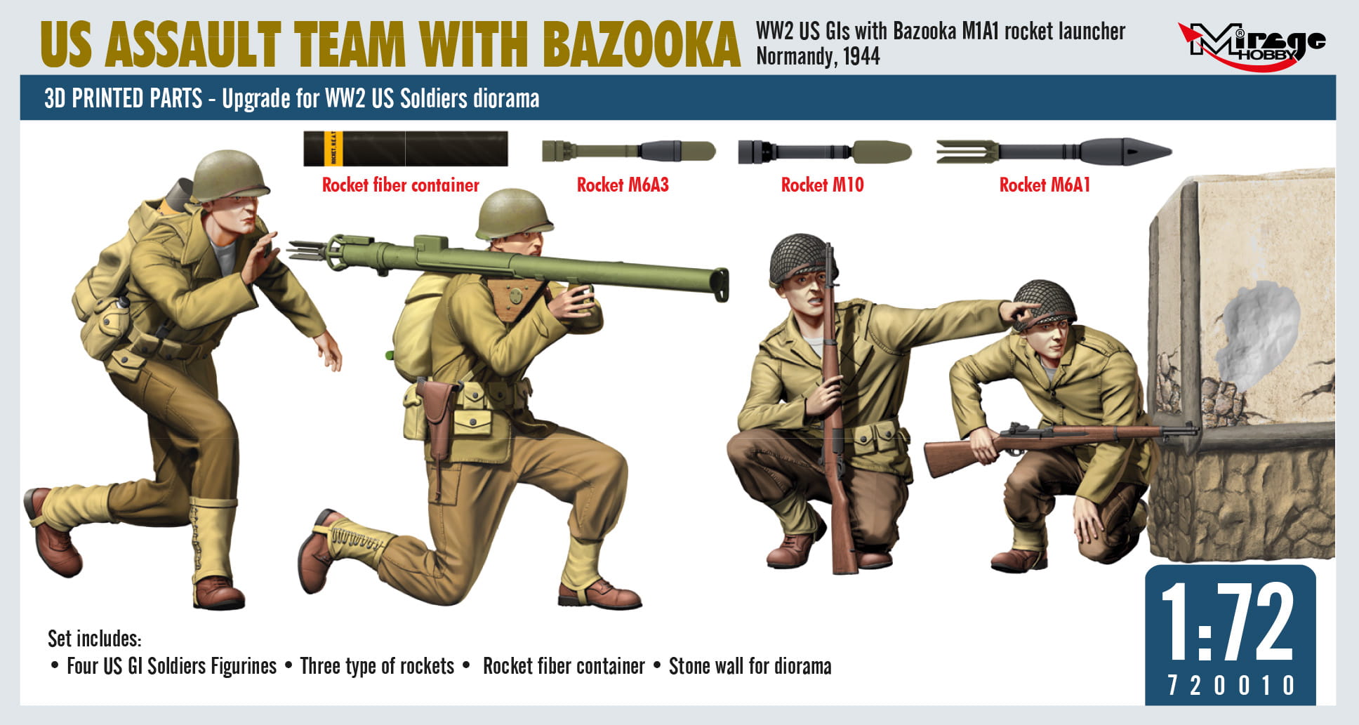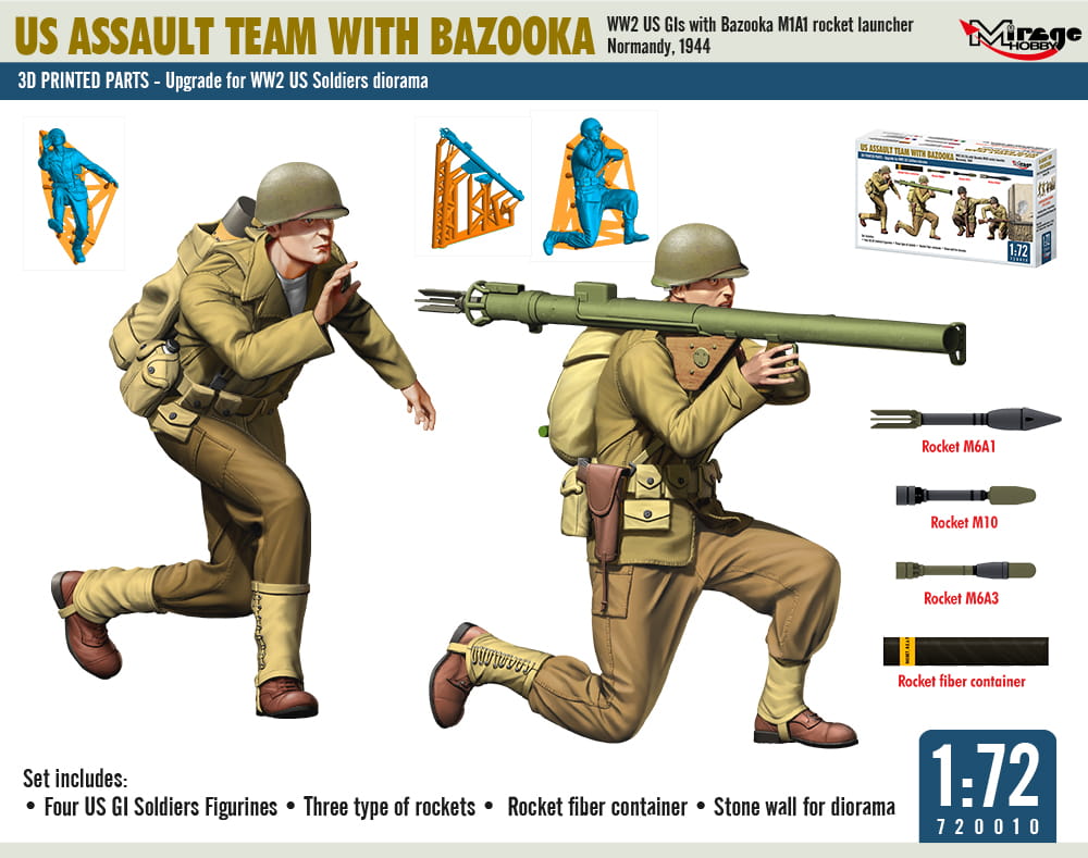 Modele plastikowych figurek do sklejania w skali 1:72, amerykańskiej grupy szturmowej z wyrzutnią Bazooka.