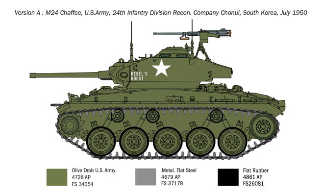 M24 Chaffee został wdrożony do batalionów pancernych US Army od 1944 roku, aby zapewnić lekki czołg bojowy, który mógłby skutecznie zastąpić starsze M3 / M5 Stuart. Konfiguracja M-24 była pod wieloma względami lepsza od swojego poprzednika, można go uznać za jeden z czołowych czołgów lekkich, jakie kiedykolwiek wyprodukowano. Zwinny, wytrzymały i niezawodny, jego głównym uzbrojeniem było działo M6 kal. 75 mm na 48 pocisków, bardzo potężna wersja "czołgu lekkiego". Uzbrojenie czołgu uzupełniały dwa karabiny maszynowe Browning kal. 12,7 mm. Po zakończeniu II wojny światowej, gdzie jego możliwości zostały w pełni zademonstrowane, brał udział w wojnie koreańskiej, wspierając czołgi M4 Sherman i cięższe M26 Pershing. Był również skutecznie wykorzystywany w zaawansowanych rolach rozpoznawczych lub zapewnianiu bliskiego wsparcia piechoty.
