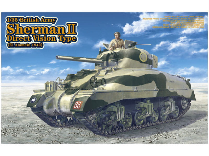 Model plastikowy do sklejania w skali 1:35, amerykańskiego czołgu średniego M4 Sherman II Direct vision type (El Alamein 1942) z okresu II wojny światowej.