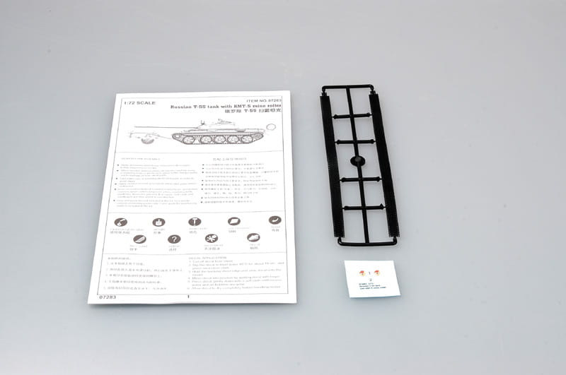 Model plastikowy do sklejania w skali 1:72, radzieckiego czołgu T-55 z zamontowanym trałem (pługiem) przeciwminowym KMT-5.