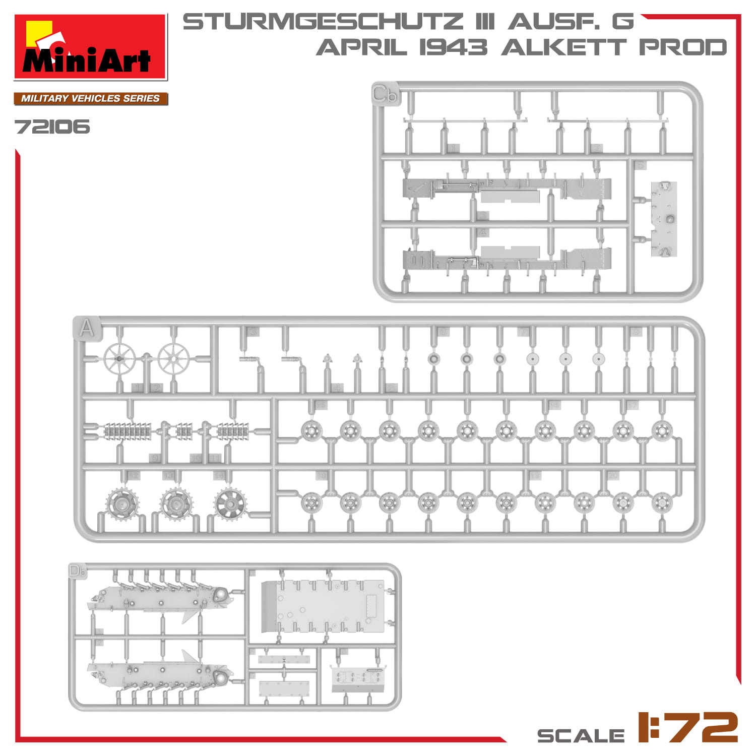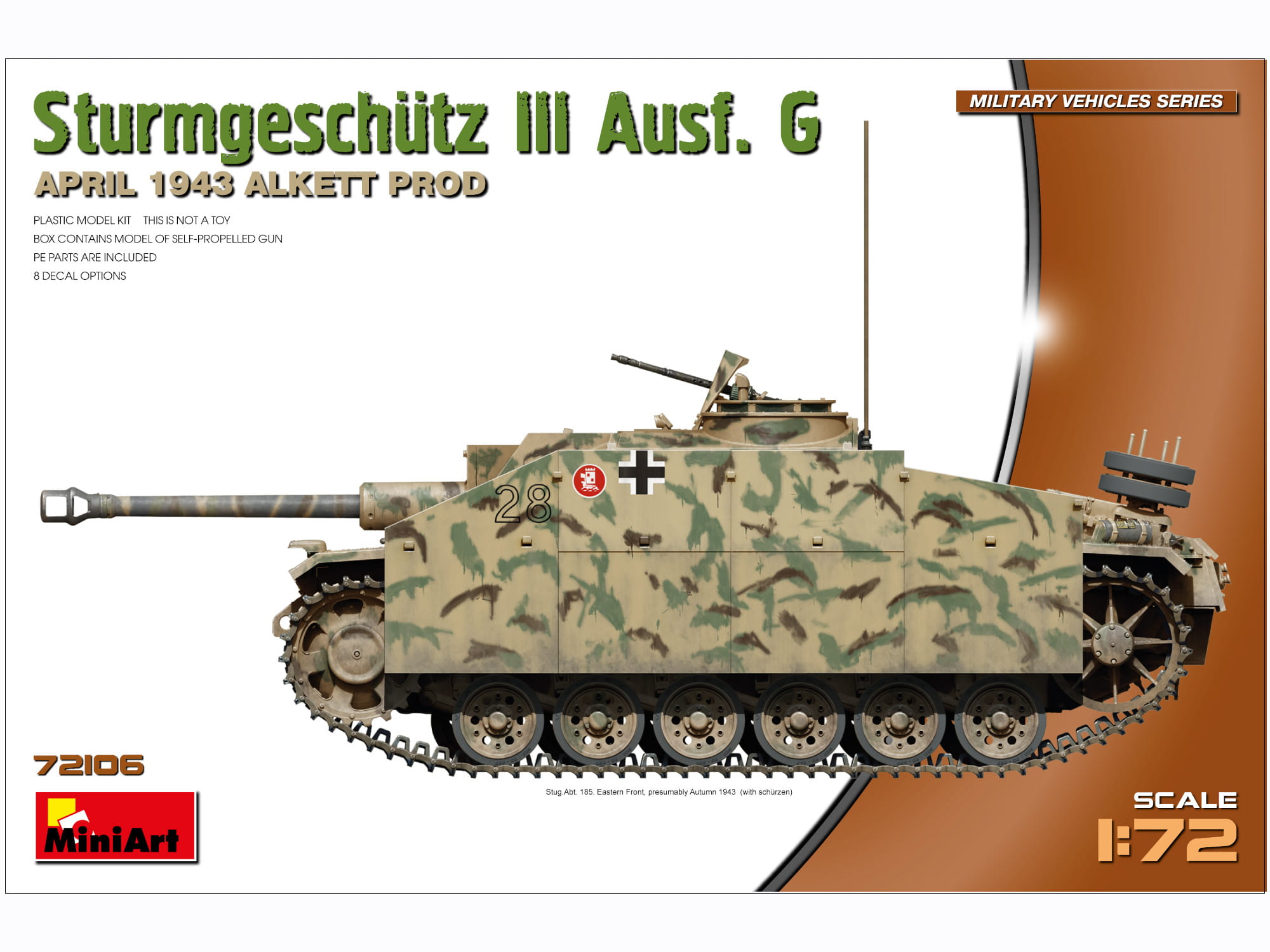 Model plastikowy do sklejania w skali 1:72, działa pancernego StuG Sturmgeschutz III Ausf.G April 1943 Alkett Production, z okresu II wojny światowej.