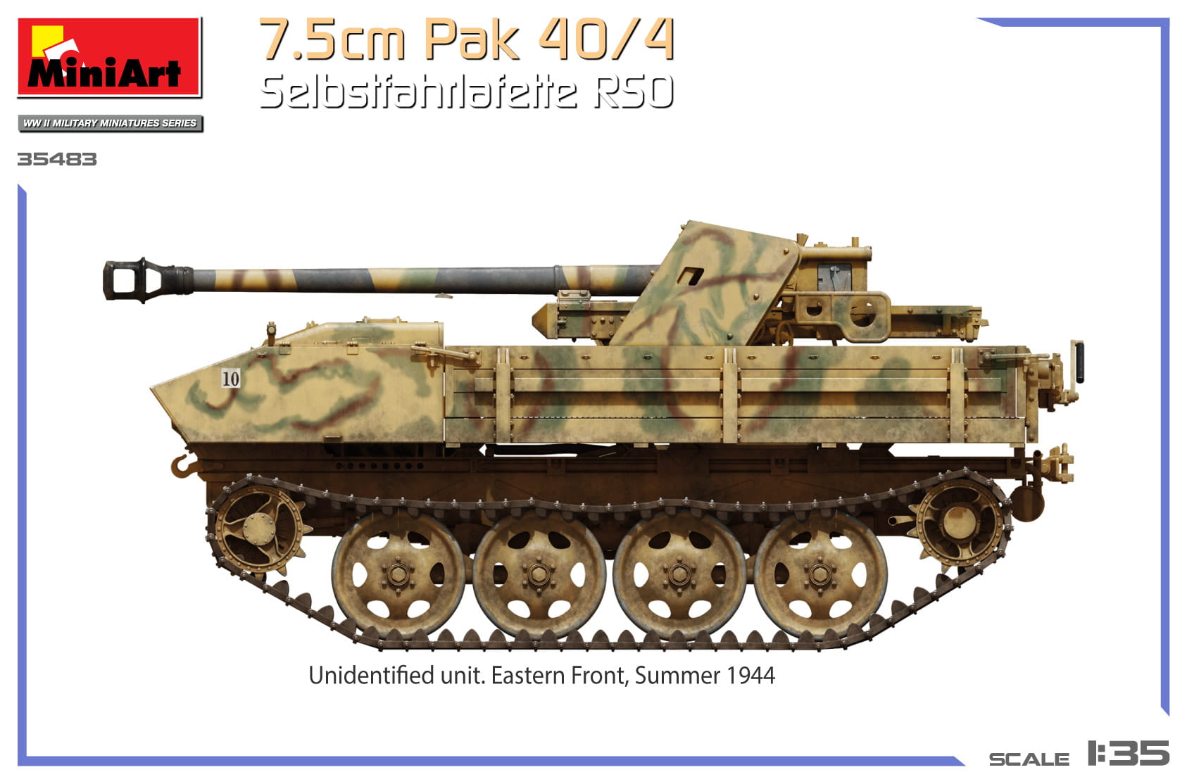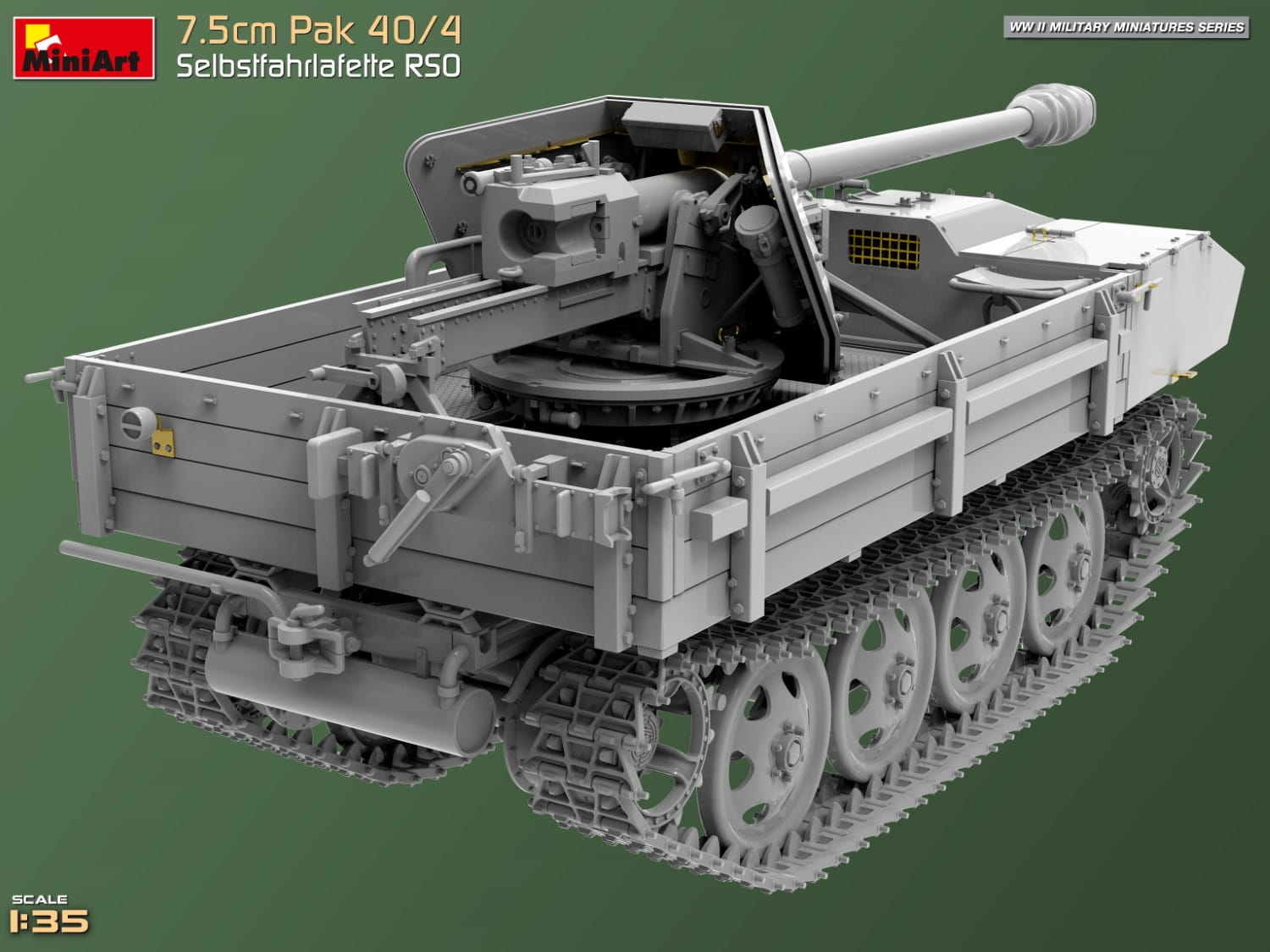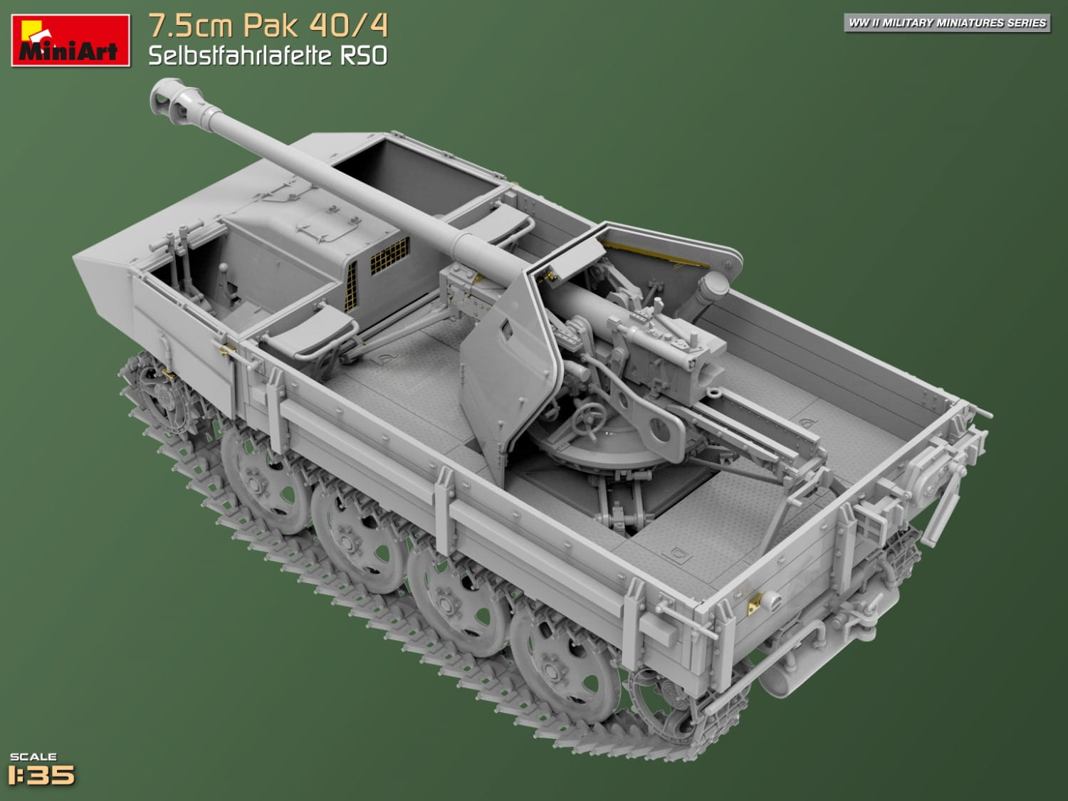 Model plastikowy do sklejania w skali 1:35, niemieckiego działa samobieżnego 7.5cm Pak 40/4 Selbstfahrlafette RSO, z okresu II wojny światowej.