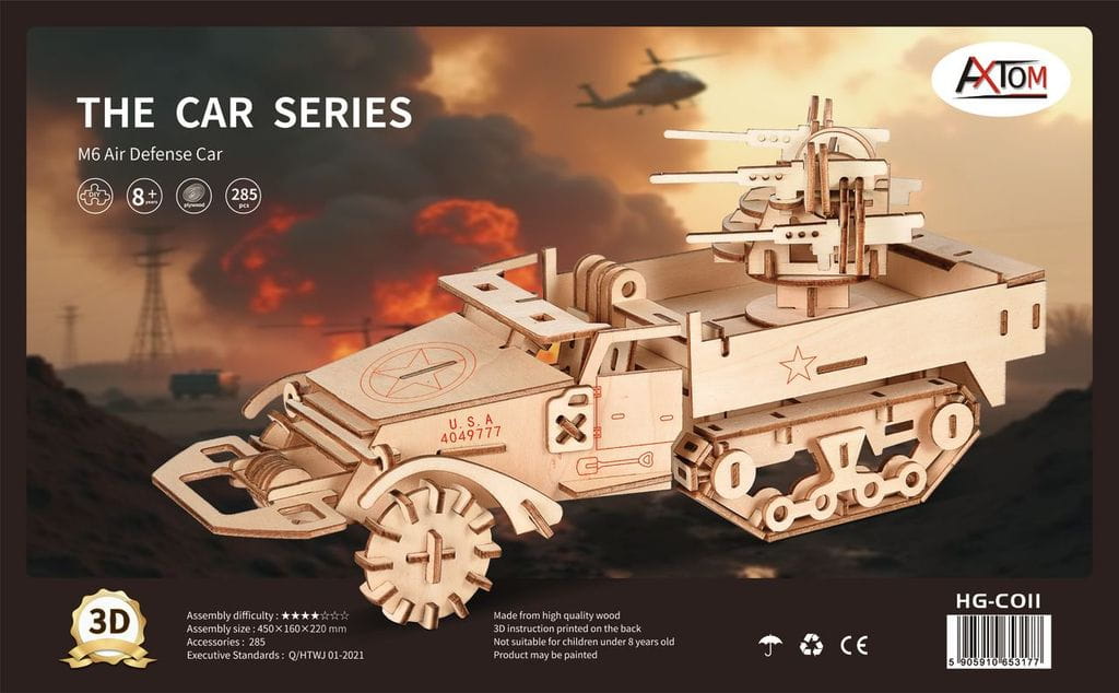 Działo samobieżne M16 z drewnianych puzzli przestrzennych 3D do samodzielnego składania. Pasjonująca zabawa, łącząca elementy pracy twórczej z rozwijaniem wyobraźni przestrzennej oraz zdolności manualnych dzieci. Drewniany model powstaje poprzez systematyczne wyciskanie elementów z naciętych arkuszy sklejki drewnianej i dopasowanie ich ze sobą wg. załączonej instrukcji obrazkowej. Odnajdujemy pary numerów na rysunkach i łączymy ze sobą części oznaczone tym samym numerem. W razie konieczności brzegi wyciśniętych elementów, przed łączeniem ze sobą wygładzamy papierem ściernym. Aby zapewnić mocne i trwałe połączenie używamy kleju do drewna. Po złożeniu model można pomalować farbami modelarskimi. Zabawka edukacyjna, która pomaga małym budowniczym i architektom poznać materiały i metody konstrukcji. Jest to świetne zajęcie które pozwala dzieciom myśleć oraz tworzyć konstrukcje i budowle, rozwijając wyobraźnię przestrzenną i zdolności manualne.