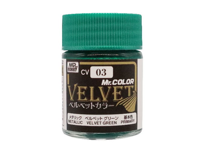 Mr.Color Velvet to metaliczna farba akrylowa, oparta na rozpuszczalnikach organicznych. Nadaje aksamitny, metaliczny połysk, a efekty wizualne zmieniają się w zależności od kąta patrzenia. Jest przeznaczona do stosowania zarówno na powierzchniach o fakturze tkaniny, jak i na częściach mechanicznych. Kolor bazowy to zazwyczaj czerń, ale jeśli użyjemy szarego lub białego koloru bazowego, wygląd farby będzie się zmieniał w zależności od niego. Zalecane do aplikacji aerografem ze względu na formułę farby i drobne właściwości pigmentu.