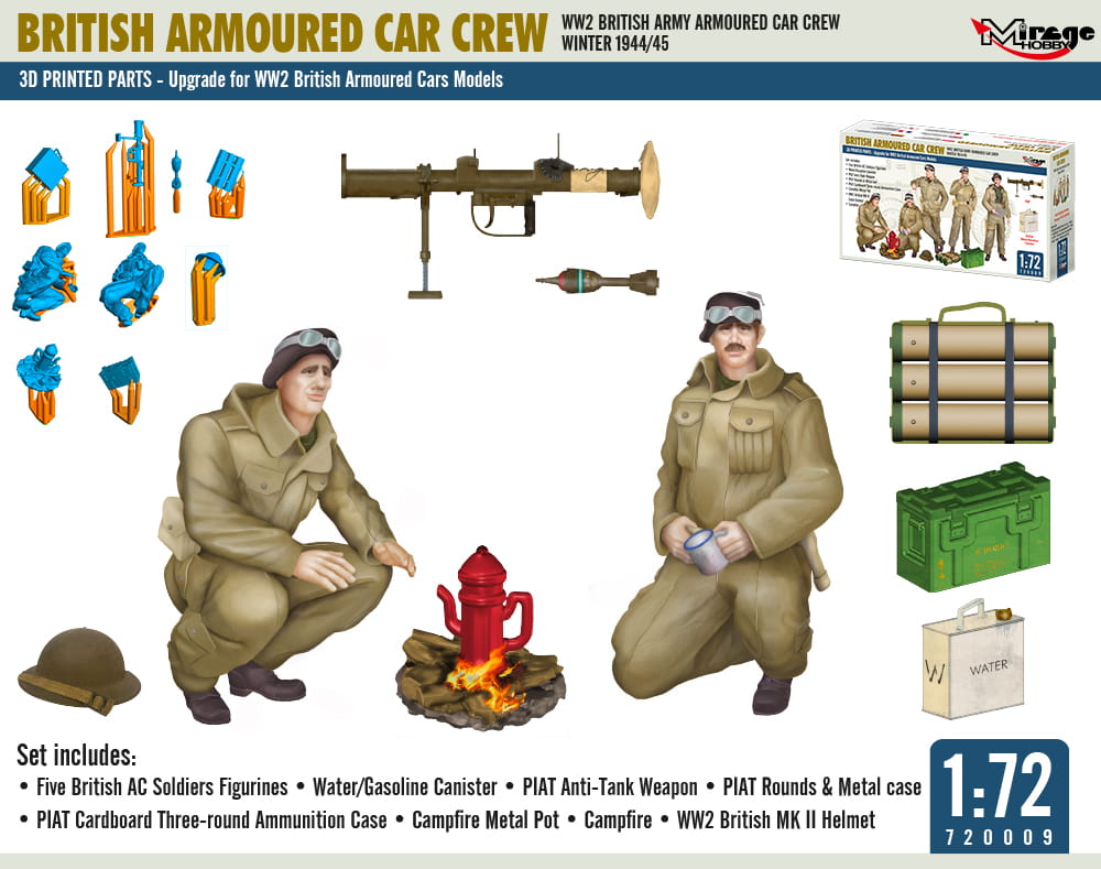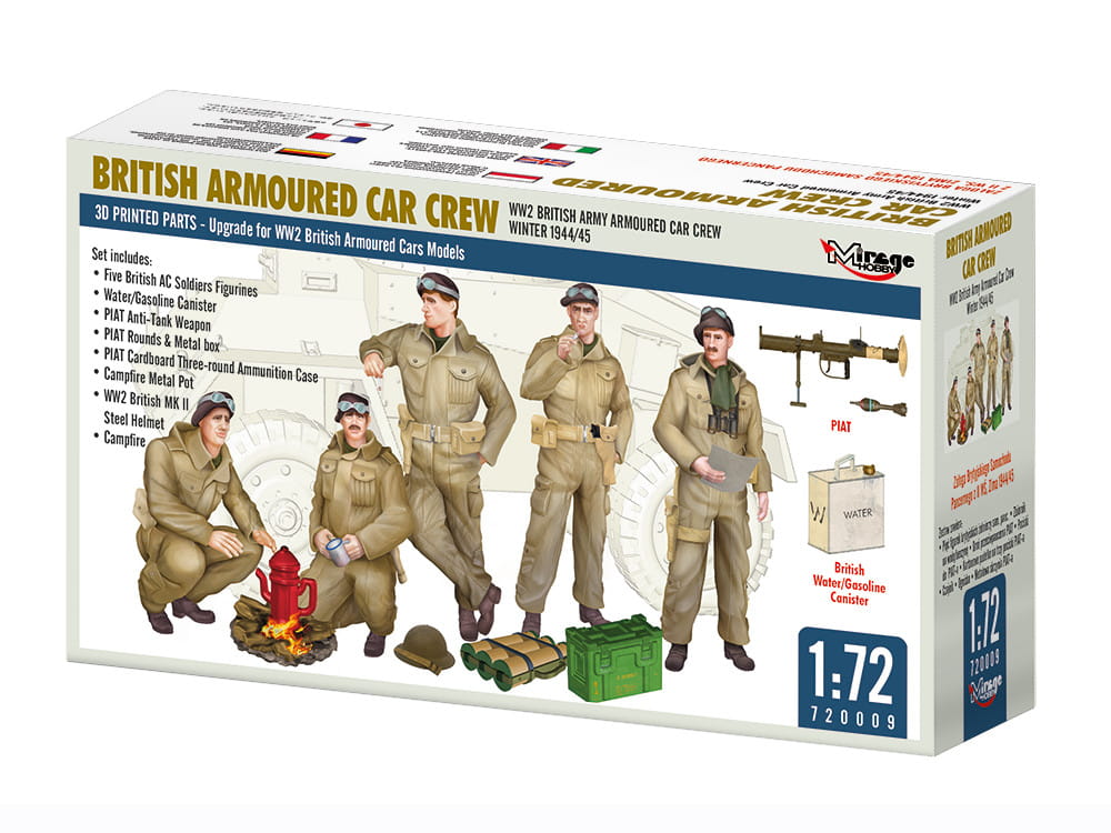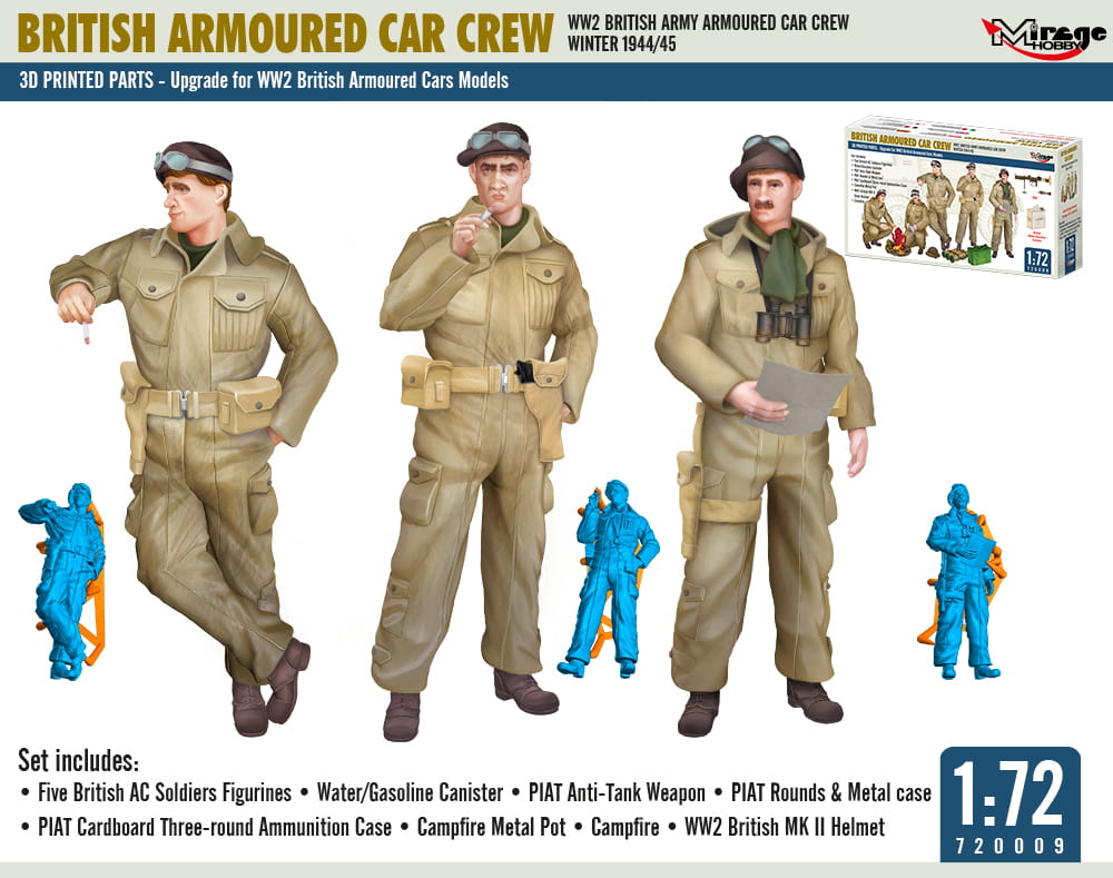 Modele plastikowych figurek do sklejania w skali 1:72, brytyjskiej załogi samochodu pancernego 1944/45.