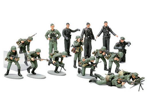 Modele plastikowych figurek do sklejania w skali 1:48, oddziału niemieckiej piechoty z okresu II wojny światowej. Postacie przedstawiają 10 niemieckich żołnierzy z początku II wojny światowej w pozach szarżujących i strzelających, a także 5 członków załogi czołgu, idealnych do montażu na modelach opancerzonych pojazdów bojowych w skali 1:48, takich jak Tiger I, StuG III i Hetzer. Niezwykle dokładne odlewy obejmują subtelne detale, takie jak granaty ręczne i pasy parciane, a dołączona jest oddzielna plastikowa broń i wyposażenie, które zwiększają realizm.