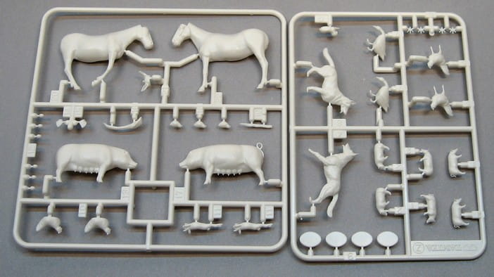 Modele plastikowych figurek do sklejania w skali 1:35, zwierząt domowych: muł (1), pies (1), szczeniak (1), świnia (1), prosięta (3), koguty (2), kury (2), pisklęta (3), gęsi (2), króliki (2), dodających dodatkową warstwę autentyczności w dioramie.