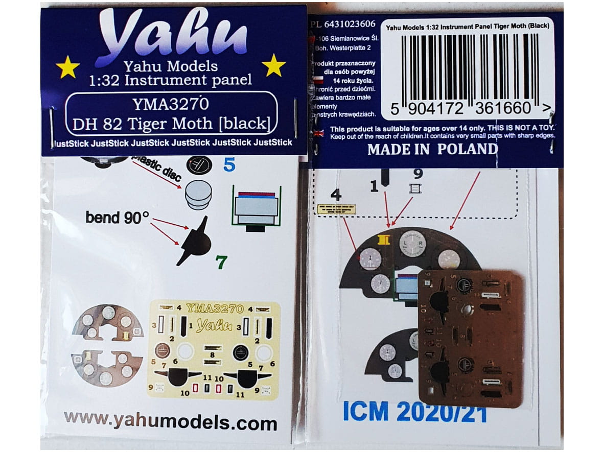 Fototrawiona, barwiona tablica przyrządów, gotowa do zamontowania w modelu (JustStick). Zestaw elementów fototrawionych do waloryzacji modeli, przeznaczony jest do stosowania w modelach samolotu De Havilland DH 82 Tiger Moth (black), w skali 1:32 z oferty firmy ICM.