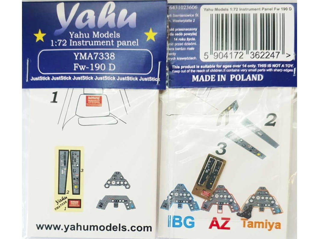 Fototrawiona, barwiona tablica przyrządów, gotowa (JustStick) do zamontowania w modelu. Zestaw elementów fototrawionych do waloryzacji modeli, przeznaczony jest do stosowania w modelach samolotu Focke Wulf Fw190 D, w skali 1:72 z oferty firm IBG, AZ, Tamiya.