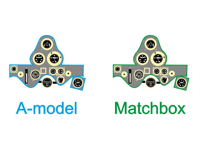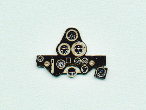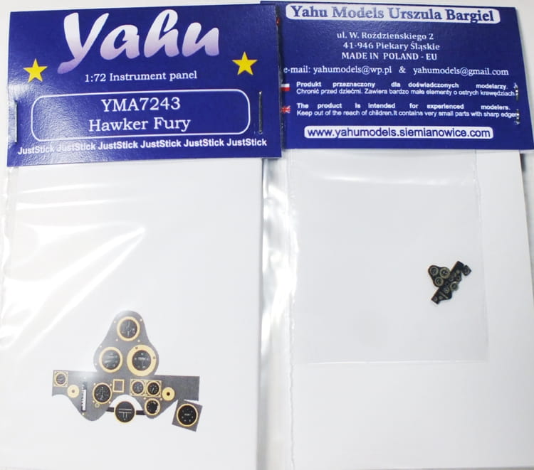 Fototrawiona, barwiona tablica przyrządów, gotowa do zamontowania w modelu (JustStick). Zestaw elementów fototrawionych do waloryzacji modeli, przeznaczony jest do stosowania w modelach samolotu Hawker Fury Mk.I, w skali 1:72 z oferty firm Amodel i Matchbox.
