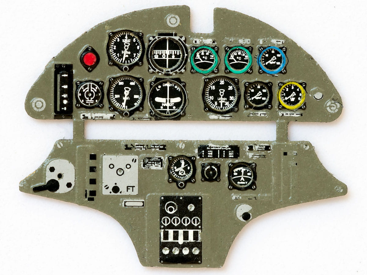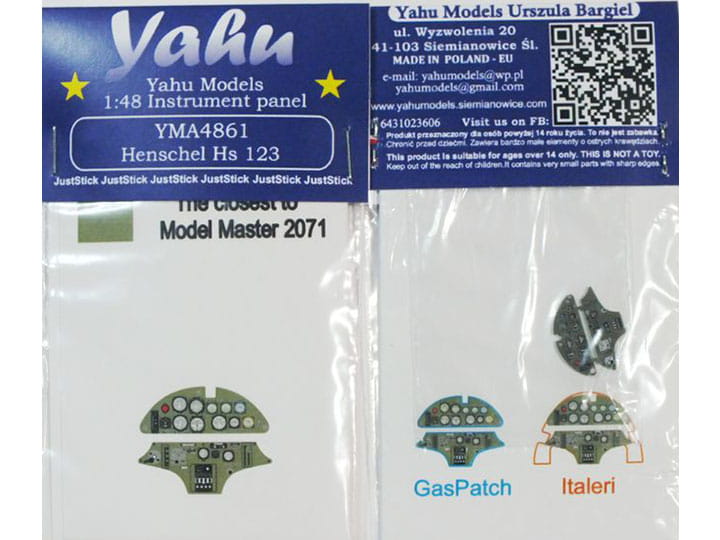 Fototrawiona, barwiona tablica przyrządów, gotowa do zamontowania w modelu (JustStick). Zestaw elementów fototrawionych do waloryzacji modeli, przeznaczony jest do stosowania w modelach samolotu Henschel Hs 123, w skali 1:48 z oferty firm GasPatch Models i Italeri.