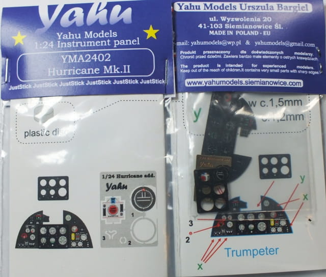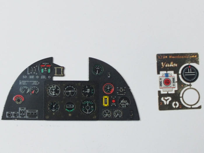 Fototrawiona, barwiona tablica przyrządów, gotowa do zamontowania w modelu (JustStick). Zestaw elementów fototrawionych do waloryzacji modeli, przeznaczony jest do stosowania w modelach samolotu Hawker Hurricane Mk.II, w skali 1:24 z oferty firmy Trumpeter.