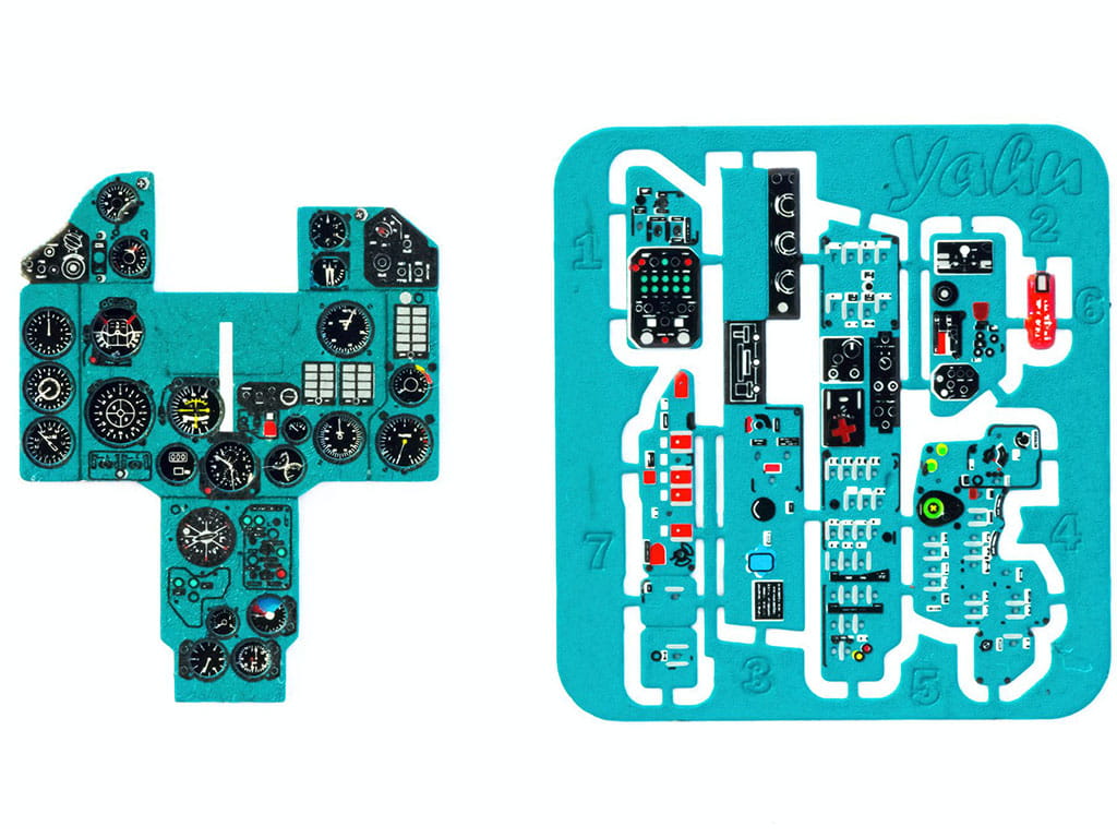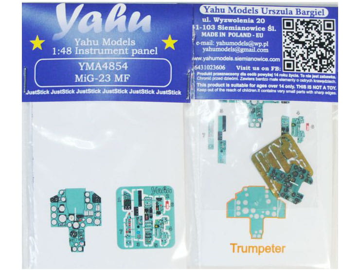Fototrawiona, barwiona tablica przyrządów, gotowa (JustStick) do zamontowania w modelu. Zestaw elementów fototrawionych do waloryzacji modeli, przeznaczony jest do stosowania w modelach samolotu MiG-23MF, w skali 1:48 z oferty firmy Trumpeter.
