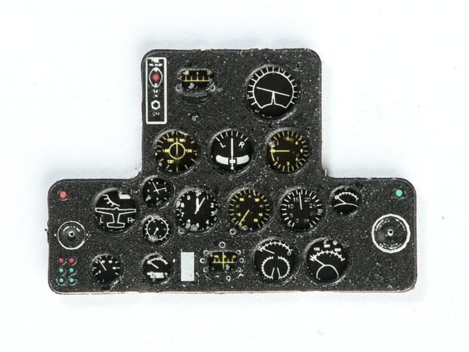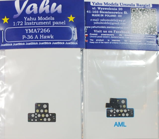 Fototrawiona, barwiona tablica przyrządów, gotowa do zamontowania w modelu (JustStick). Zestaw elementów fototrawionych do waloryzacji modeli, przeznaczony jest do stosowania w modelach samolotu Curtiss P-36A Hawk, w skali 1:72 z oferty firm AML, Azur i Special Hobby.
