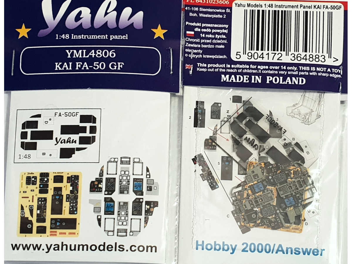 Fototrawiona tablica przyrządów do własnoręcznego montażu. Zestaw elementów fototrawionych do waloryzacji modeli, przeznaczony jest do stosowania w modelach samolotu KAI FA-50 GF, w skali 1:48 z oferty firm Hobby 2000 i Answer.