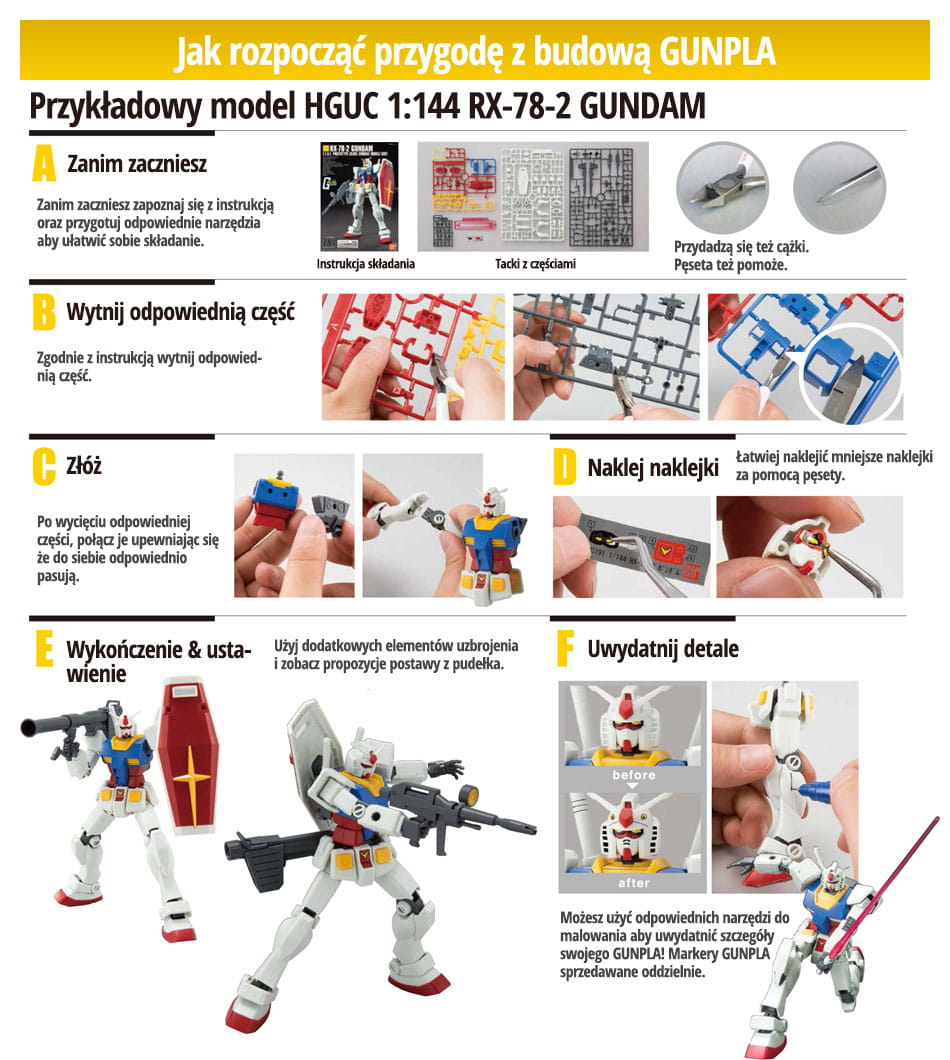 Modele Gundam (ガンダム) zwane również jako GUNPLA to modelowe zestawy przedstawiające w unikalny sposób pojazdy i postacie fikcyjnego wszechświata Mobile Suit Gundam autorstwa Bandai. Te zestawy stały się popularne wśród miłośników anime-mecha i entuzjastów modeli w Japonii oraz innych krajach Azji. Uniwersum Gundam jest ogromne, dlatego też samych modeli GUNPLA są setki, a każdy z nich posiada swój unikalny wygląd. Samo składanie modeli GUNPLA jest fantastyczną formą rozrywki na wiele godzin a efekt końcowy potrafi zachwycić każdego! Nawet osoby, które z modelarstwem nie miały do tej pory zbyt dużego kontaktu. Modele GUNPLA są nie lada gratką dla kolekcjonerów. Dzięki takim zestawom uczymy się cierpliwości, logicznego myślenia, rozwijamy zdolności manualne. Jest to świetna zabawa dla każdego! Modele budujemy od podstaw, każdy zestaw zawiera określoną ilość elementów z najwyższej jakości plastiku, które łączymy ze sobą bez użycia kleju. Każdy z modeli GUNPLA jest w pełni ruchomy co daje nieograniczone możliwości jego ustawienia. W każdym zestawie oprócz samego modelu znajdziemy również wiele dodatków takich jak broń, akcesoria, naklejki lub kalkomanię czy też różne warianty budowy samych modeli. Oczywiście nic nie stoi na przeszkodzie by samodzielnie spersonalizować swojego GUNPLA za pomocą farb, tak aby stał się jedyny w swoim rodzaju!