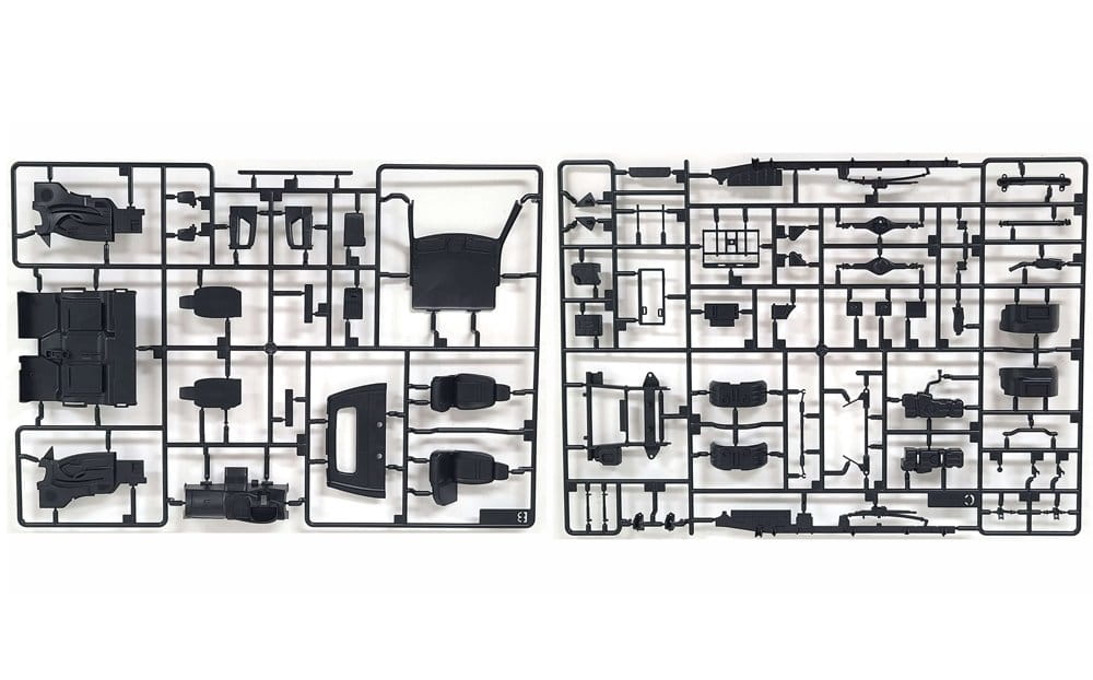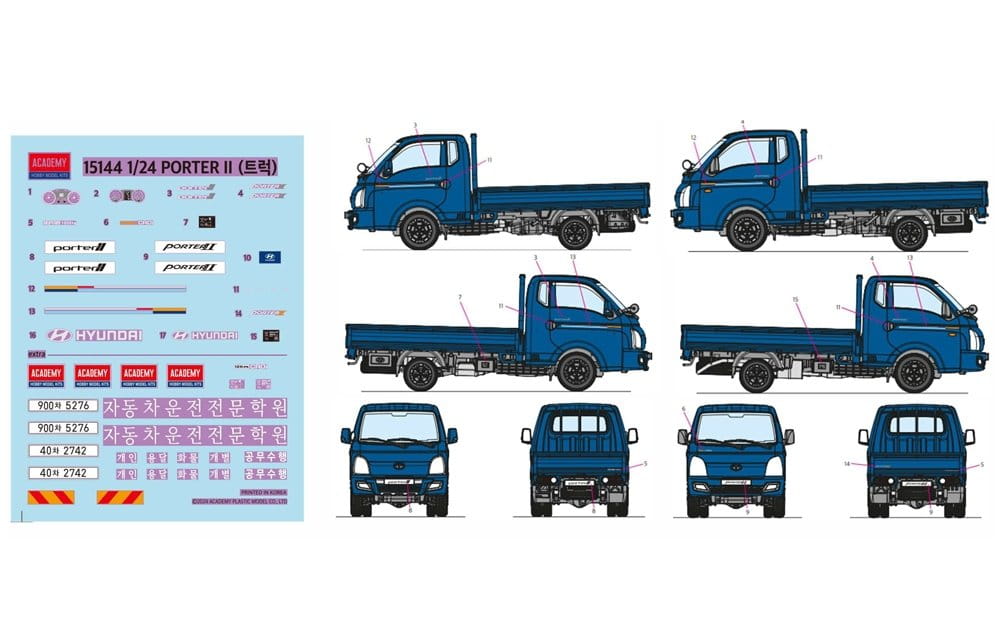 Model plastikowy do sklejania w skali 1:24, południowokoreańskiego samochodu dostawczego Hyundai Porter II Cargo Truck, w wersji skrzyniowej z otwartą platformą ładunkową.