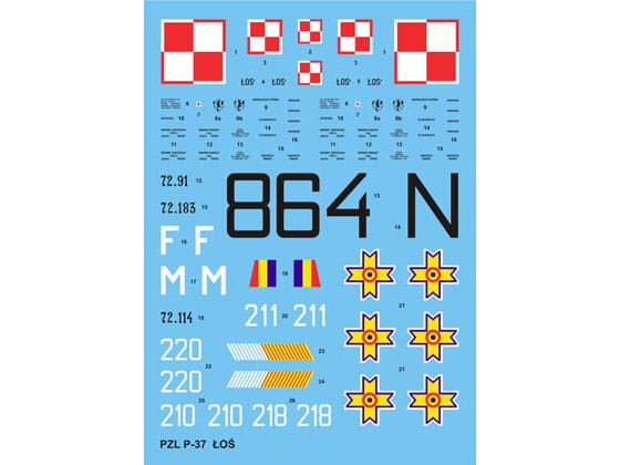 Kalkomania do modeli do sklejania w skali 1:48, polskiego samolotu PZL P.37B Łoś z okresu II wojny światowej. Kalkomania posiada instrukcję rozmieszczenia znaków wraz z podanymi kolorami.