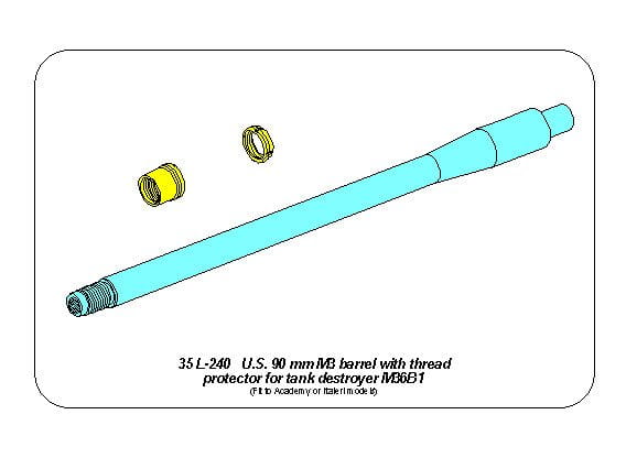 Metalowa lufa 90mm M3 z osłoną gwintu na końcu lufy do waloryzacji modeli, przeznaczona do stosowania w modelach amerykańskiego niszczyciela czołgów M36B1 w skali 1:35, z oferty firm Academy i Italeri. Produkt dedykowany jest dla doświadczonych modelarzy do bardzo dokładnego odzwierciedlenia realistycznego wyglądu modelu. Elementy zestawu wiernie odwzorowują szczegóły pominięte lub wykonane niezbyt dokładnie w plastikowym modelu.