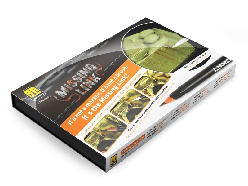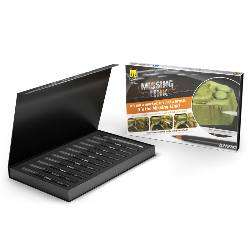 Zestaw markerów akwarelowych z pędzelkową końcówką od AMMO by MIG Jimenez to przełom w dziedzinie narzędzi modelarskich. Zaprojektowany z myślą o precyzji, wszechstronności i łatwości użytkowania. Ten zestaw 12 transparentnych kolorów został starannie dobrany, aby odtworzyć realistyczne efekty na modelach pojazdów wojskowych. Dzięki markerom Brush Marker Missing Link możesz nakładać na swoje modele wszystko, od filtrów po efekty postarzania. Każdy marker posiada precyzyjną, elastyczną końcówkę pędzla, która zapewnia płynne, kontrolowane pociągnięcia - od cienkich linii po średnie i szerokie krycie - dzięki czemu idealnie nadaje się zarówno do prac szczegółowych, jak i efektów na dużych powierzchniach, bez konieczności zmiany narzędzi.