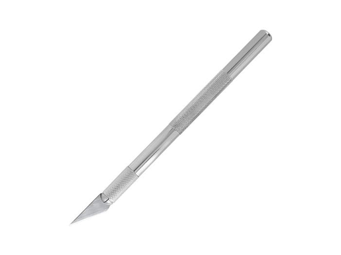 Aluminiowy radełkowany uchwyt #1 z ostrzem #11 do precyzyjnych cięć pod kątem, rzeźbienia, przekłuwania, nacinania, skrobania, trasowania i przycinania. Ta smukła rękojeść z radełkowanym uchwytem jest łatwa w obsłudze, zapewniając pełną kontrolę podczas pracy nad szczegółowymi i delikatnymi zadaniami.
