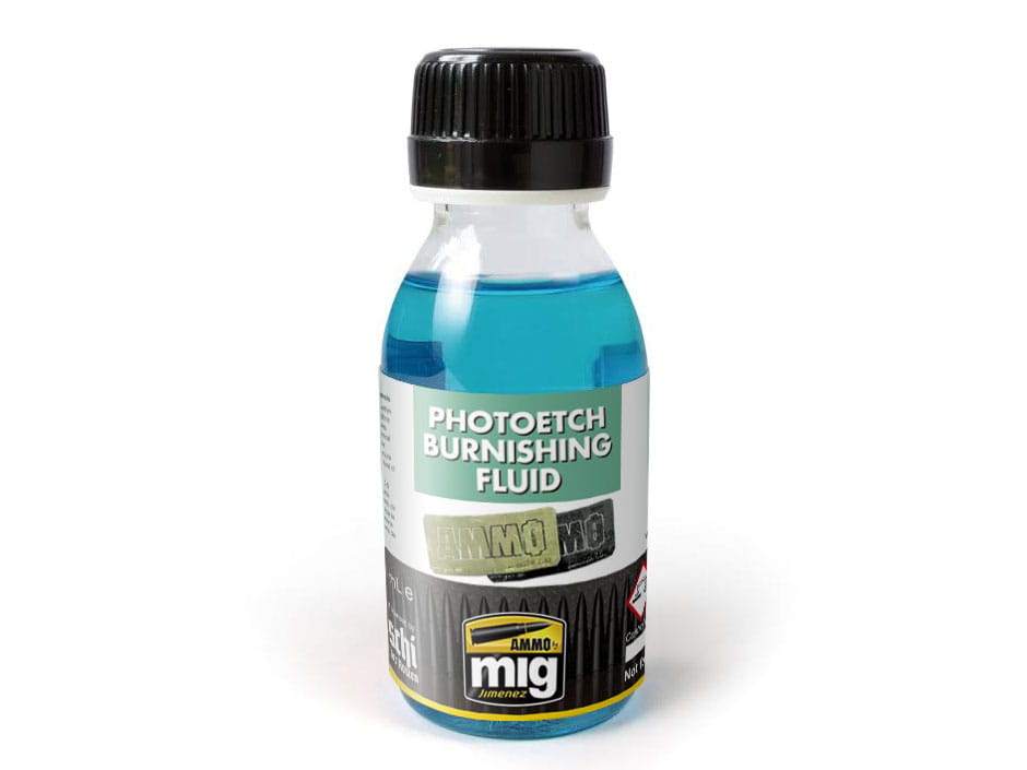 Płyn do czernienia mosiężnych dodatków modelarskich, takich jak lufy i elementy fototrawione. Szybkie poczernienie na toczonych mosiężnych lufach i elementach fototrawionych następuje w ciągu około 3-5 minut. Photoetch Burnishing Fluid pozwala również na czernienie cyny lutowniczej używanej do lutowania, aby uzyskać jednolity efekt.