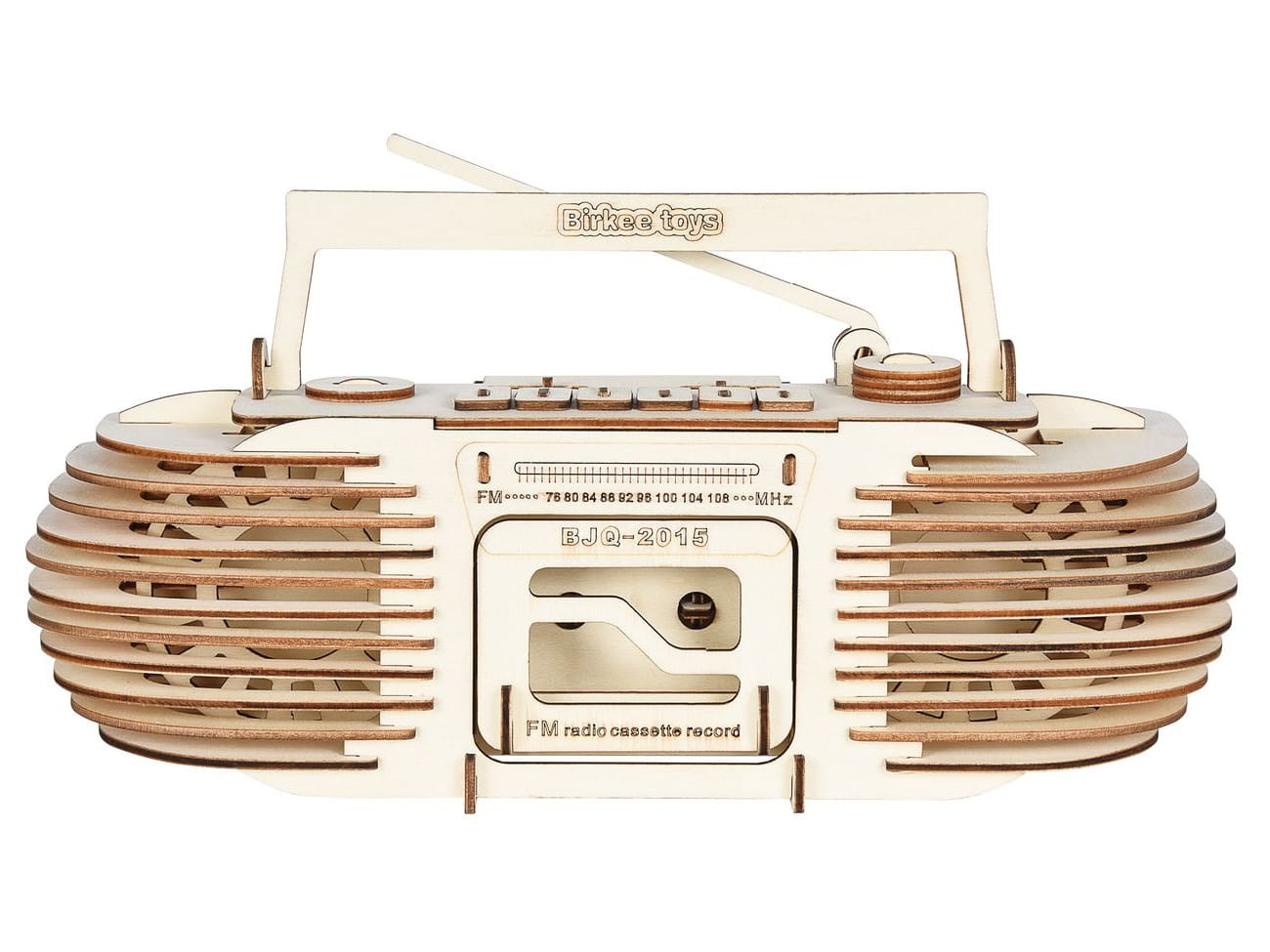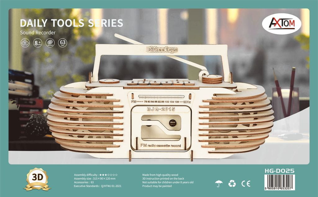 Radiomagnetofon z drewnianych puzzli przestrzennych 3D do samodzielnego składania. Pasjonująca zabawa, łącząca elementy pracy twórczej z rozwijaniem wyobraźni przestrzennej oraz zdolności manualnych dzieci. Drewniany model powstaje poprzez systematyczne wyciskanie elementów z naciętych arkuszy sklejki drewnianej i dopasowanie ich ze sobą wg. załączonej instrukcji obrazkowej. Odnajdujemy pary numerów na rysunkach i łączymy ze sobą części oznaczone tym samym numerem. W razie konieczności brzegi wyciśniętych elementów, przed łączeniem ze sobą wygładzamy papierem ściernym. Aby zapewnić mocne i trwałe połączenie używamy kleju do drewna. Po złożeniu model można pomalować farbami modelarskimi. Zabawka edukacyjna, która pomaga małym budowniczym i architektom poznać materiały i metody konstrukcji. Jest to świetne zajęcie które pozwala dzieciom myśleć oraz tworzyć konstrukcje i budowle, rozwijając wyobraźnię przestrzenną i zdolności manualne.