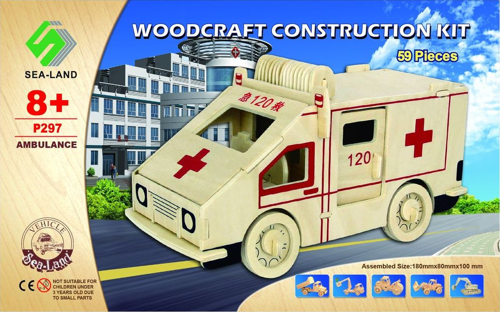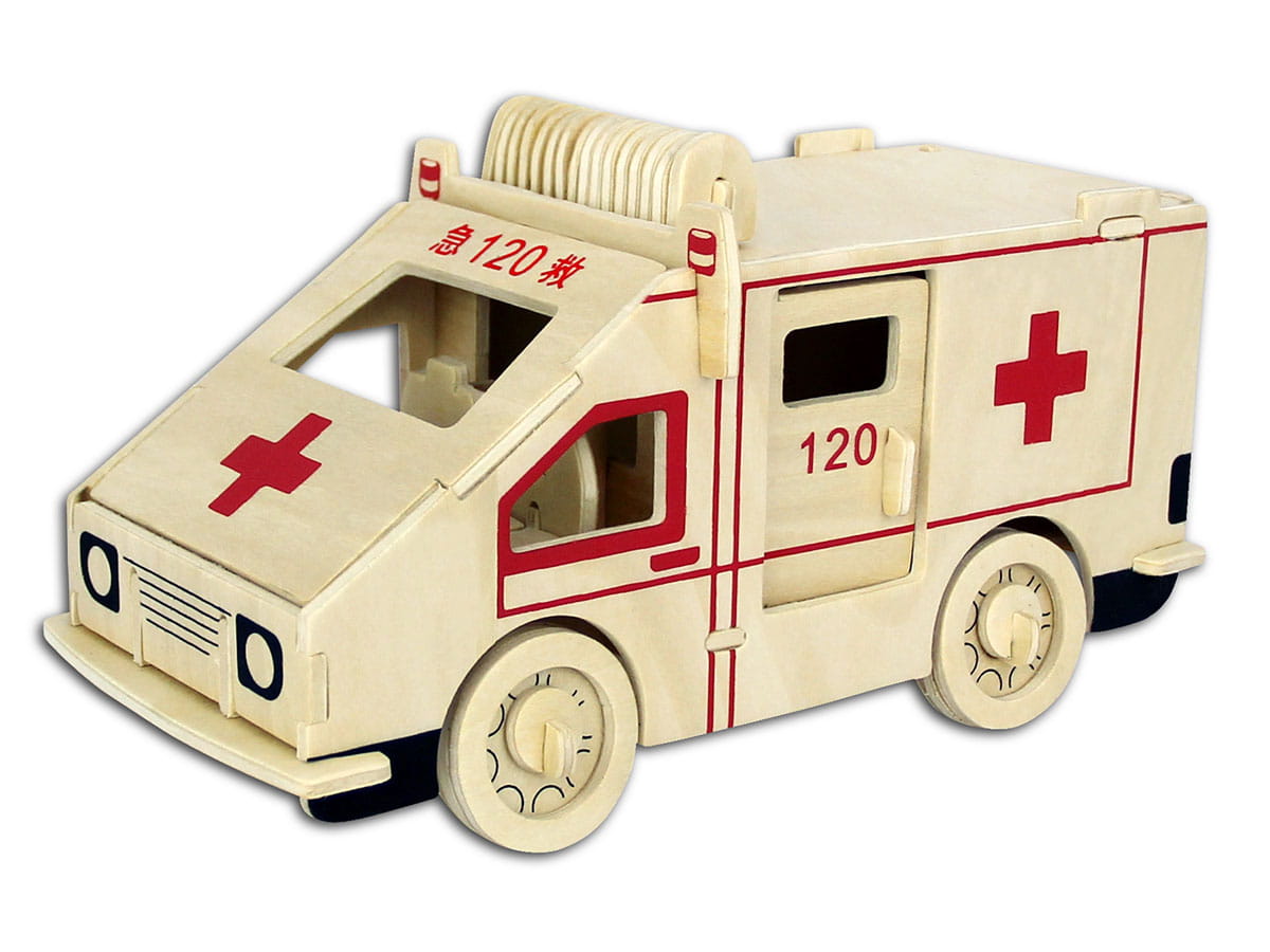 Samochód Ambulans z drewnianych puzzli przestrzennych 3D do samodzielnego składania. Pasjonująca zabawa, łącząca elementy pracy twórczej z rozwijaniem wyobraźni przestrzennej oraz zdolności manualnych dzieci. Drewniany model powstaje poprzez systematyczne wyciskanie elementów z naciętych arkuszy sklejki drewnianej i dopasowanie ich ze sobą wg. załączonej instrukcji obrazkowej. Odnajdujemy pary numerów na rysunkach i łączymy ze sobą części oznaczone tym samym numerem. W razie konieczności brzegi wyciśniętych elementów, przed łączeniem ze sobą wygładzamy papierem ściernym. Aby zapewnić mocne i trwałe połączenie używamy kleju do drewna. Po złożeniu model można pomalować farbami modelarskimi. Zabawka edukacyjna, która pomaga małym budowniczym i architektom poznać materiały i metody konstrukcji. Jest to świetne zajęcie które pozwala dzieciom myśleć oraz tworzyć konstrukcje i budowle, rozwijając wyobraźnię przestrzenną i zdolności manualne.