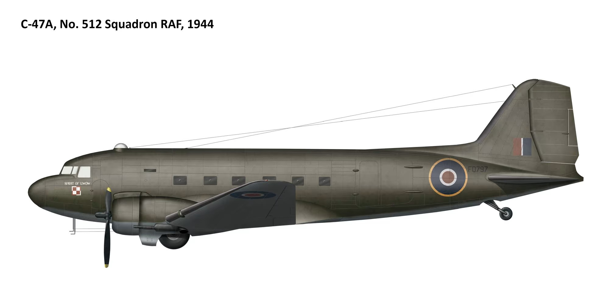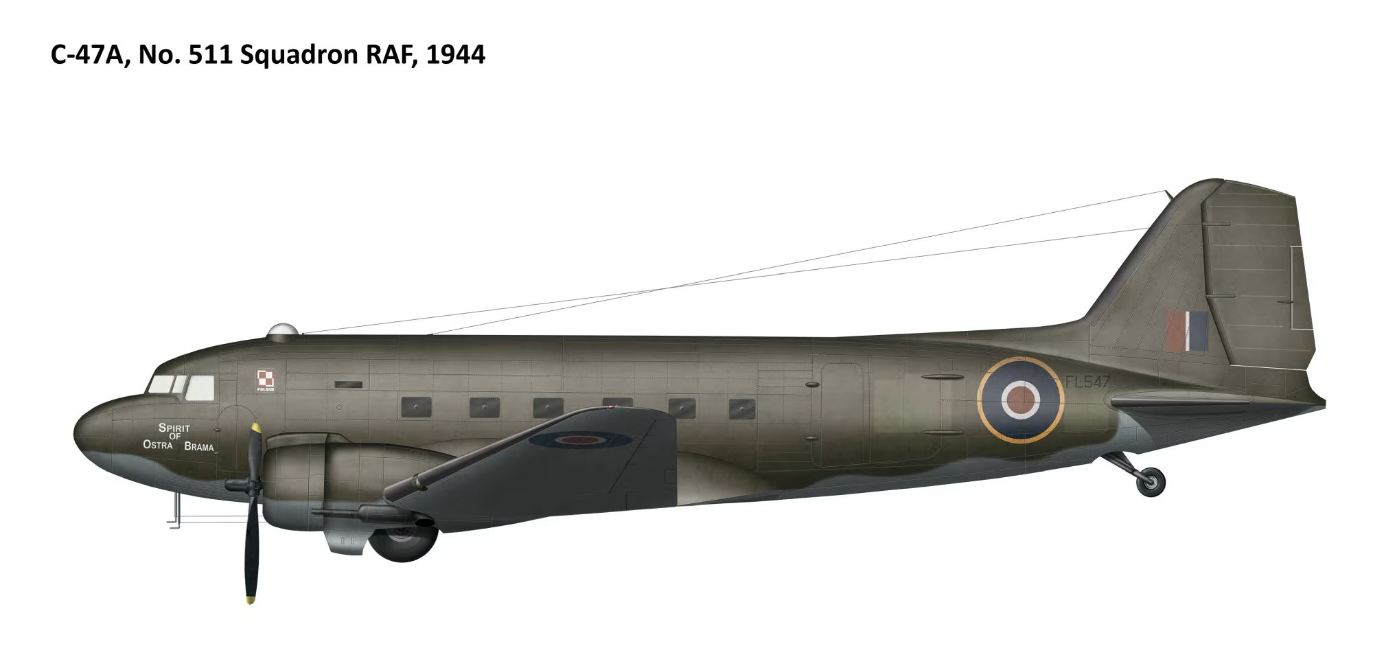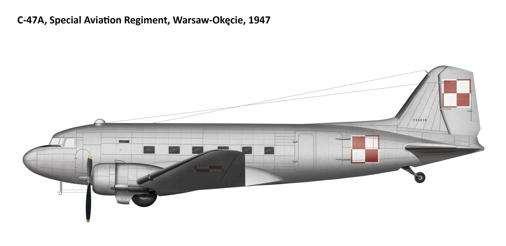 Douglas C-47A Skytrain to wojskowa wersja słynnego samolotu pasażerskiego DC-3, jeden z najbardziej niezawodnych i wszechstronnych transportowców II wojny światowej. W Polskich Siłach Powietrznych oraz w lotnictwie cywilnym po wojnie maszyna ta zapisała bardzo ważny rozdział. W czasie II wojny światowej polscy lotnicy w Wielkiej Brytanii korzystali z C-47A w jednostkach RAF-u. Były wykorzystywane głównie do transportu żołnierzy i zaopatrzenia, ewakuacji rannych, zadań łącznikowych, udziału w dużych operacjach alianckich (np. Market Garden - choć nie były to maszyny należące do polskiej jednostki, Polacy latali na nich jako członkowie załóg RAF). C-47A ceniono za niezawodność, dużą ładowność i łatwość eksploatacji. Po 1945 roku kilka egzemplarzy C-47A trafiło do Polski - zarówno poprzez wsparcie sowieckie (Lend-Lease zwrócony do ZSRR i przekazany dalej), jak i pochodzące z zasobów pozostawionych w Europie.