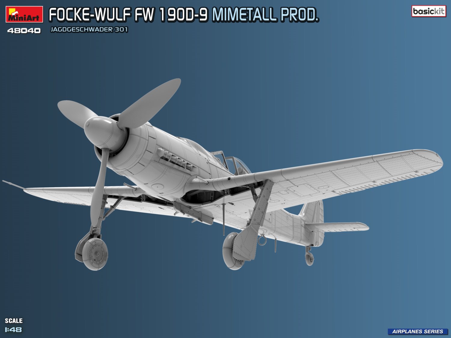 Model plastikowy do sklejania w skali 1:48, niemieckiego samolotu myśliwskiego Focke-Wulf Fw 190D-9 Mimetall Prod. Jagdgeschwader 301, z okresu II wojny światowej.