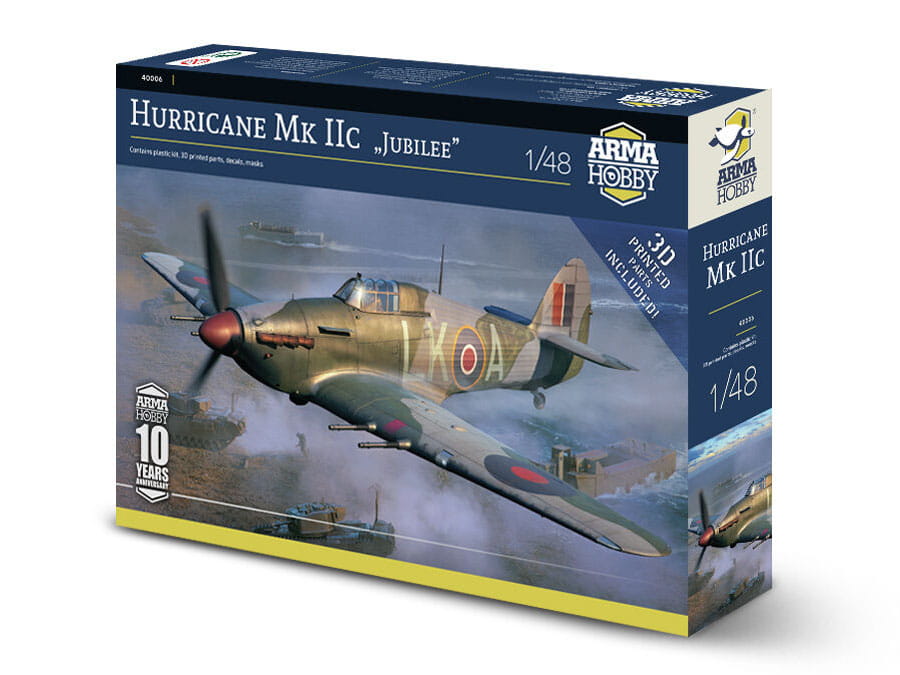 Model plastikowy do sklejania w skali 1:48, brytyjskiego myśliwca Hawker Hurricane Mk.IIc z okresu II wojny światowej.