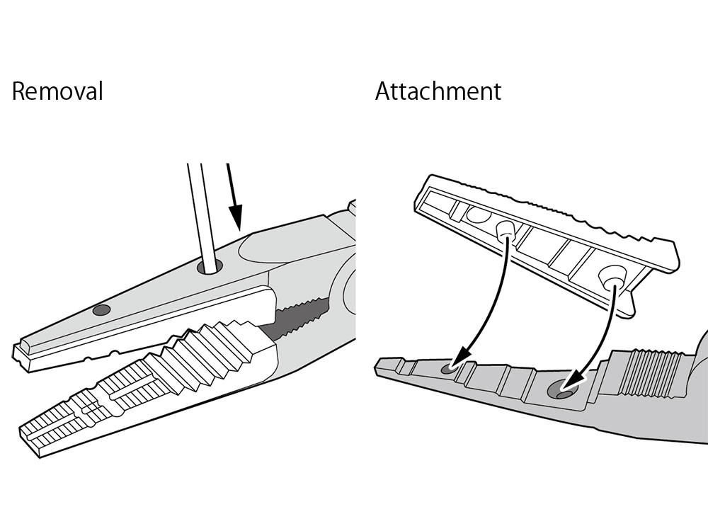 2. Dopasuj wypustki na plastikowych wkładkach do otworów w szczypcach z długimi końcówkami i zamontuj.