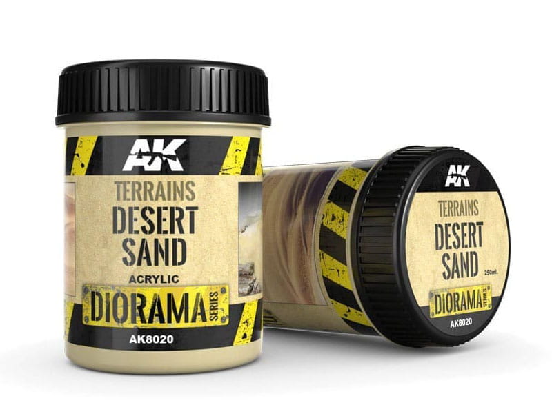 Desert sand to drobna i gładka tekstura dla każdego rodzaju sceny pustynnej, takiej jak Afryka Północna. Idealny do wykonywania wydm, produkt ten można kształtować na mokro i szlifować po wyschnięciu. Jest to wysokiej jakości produkt akrylowy opracowany z myślą o ekstremalnym realizmie. Doskonałe rezultaty przy cienkich lub grubych warstwach. Można go rozcieńczyć wodą lub rozcieńczalnikiem akrylowym, aby poprawić jego rozlewność. Nietoksyczny.
