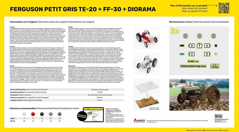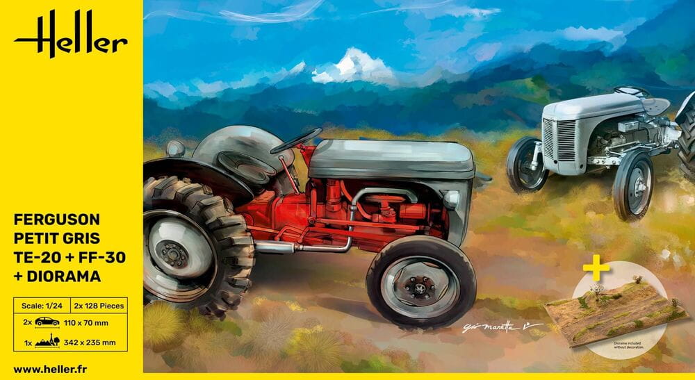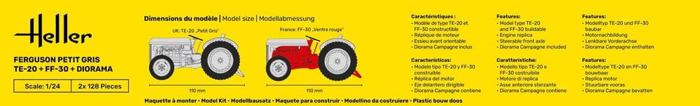 Modele plastikowe do sklejania w skali 1:24, brytyjskich ciągników rolniczych Ferguson TE-20 Petit Gris i Ferguson FF-30 Ventre rouge.
