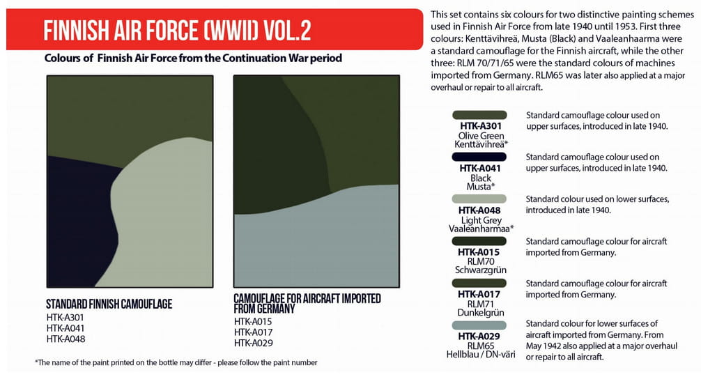 Zestaw zawiera sześć kolorów dla dwóch charakterystycznych schematów malowania używanych w Fińskich Siłach Powietrznych od końca 1940 do 1953 roku. Pierwsze trzy kolory: Olive Green Kenttavihrea, Black Musta i Light Grey Vaaleanharmaa były standardowym kamuflażem dla fińskich samolotów, natomiast pozostałe trzy: RLM70, RLM71 i RLM65 były standardowymi kolorami maszyn sprowadzanych z Niemiec. RLM65 zastosowano później także podczas większych remontów lub napraw wszystkich samolotów.