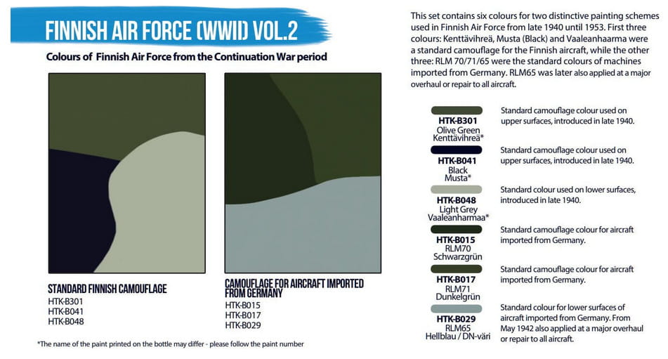 Zestaw zawiera sześć kolorów dla dwóch charakterystycznych schematów malowania używanych w Fińskich Siłach Powietrznych od końca 1940 do 1953 roku. Pierwsze trzy kolory: Olive Green Kenttavihrea, Black Musta i Light Grey Vaaleanharmaa były standardowym kamuflażem dla fińskich samolotów, natomiast pozostałe trzy: RLM70, RLM71 i RLM65 były standardowymi kolorami maszyn sprowadzanych z Niemiec. RLM65 zastosowano później także podczas większych remontów lub napraw wszystkich samolotów.
