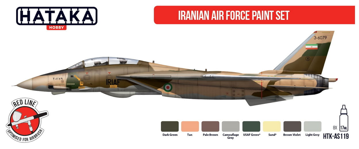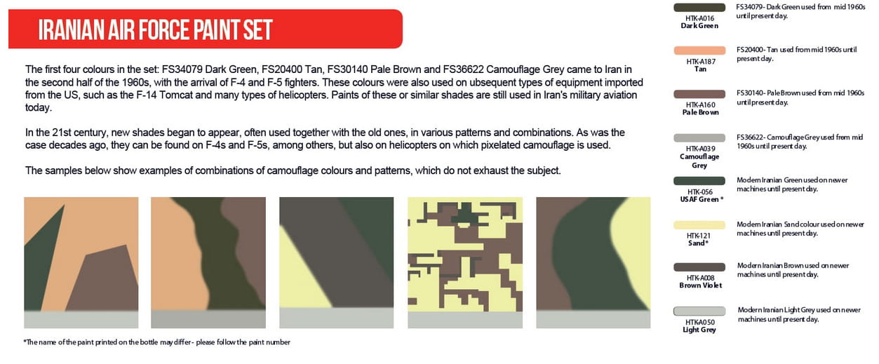 Pierwsze cztery kolory w zestawie: FS34079 Dark Green, FS20400 Tan, FS30140 Pale Brown i FS36622 Camouflage Grey trafiły do Iranu w drugiej połowie lat 60. XX wieku, wraz z pojawieniem się myśliwców F-4 i F-5. Kolory te były również używane w kolejnych typach sprzętu importowanego z USA, takich jak F-14 Tomcat i wiele typów śmigłowców. Farby w tych lub podobnych odcieniach są nadal używane w irańskim lotnictwie wojskowym. W XXI wieku zaczęły pojawiać się nowe odcienie, często używane razem ze starymi, w różnych wzorach i kombinacjach. Podobnie jak to było przed dekadami, można je znaleźć między innymi na F-4 i F-5, ale także na śmigłowcach, na których zastosowano pikselowy kamuflaż.