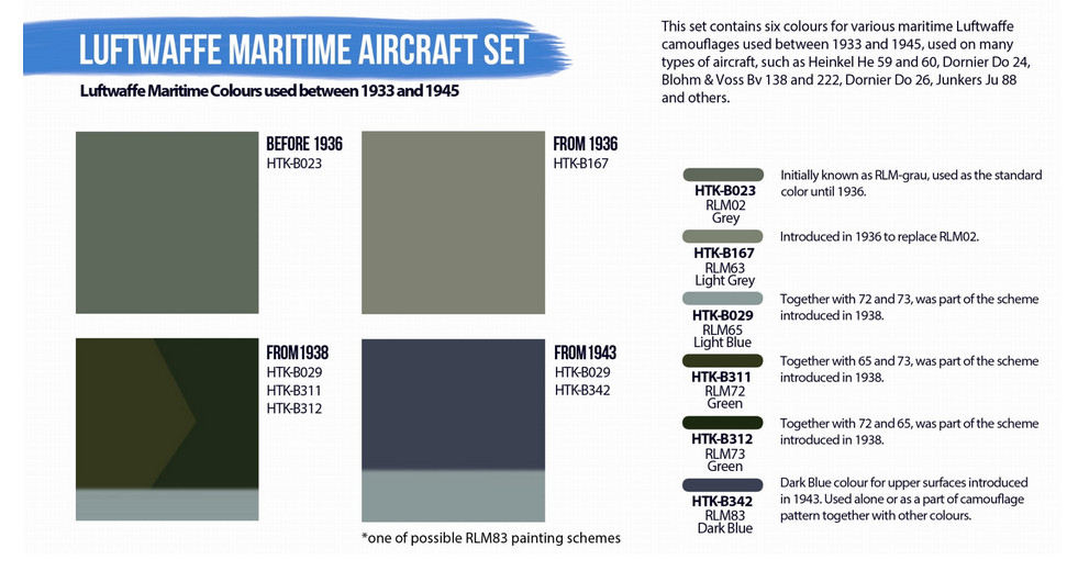 Zestaw zawiera sześć kolorów różnych kamuflaży morskich Luftwaffe używanych w latach 1933–1945 na wielu typach samolotów, takich jak Heinkel He 59 i 60, Dornier Do 24, Blohm & Voss Bv 138 i 222, Dornier Do 26, Junkers Ju 88 i inne.