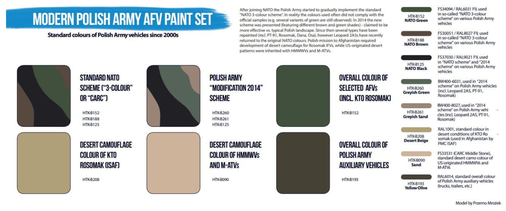 Standardowe kolory pojazdów Wojska Polskiego od lat 2000. Po przystąpieniu do NATO Wojsko Polskie zaczęło stopniowo wdrażać standardowy "NATO 3-colour scheme". W rzeczywistości używane kolory często nie były zgodne z oficjalnymi wzorcami (np. nadal występuje kilka wariantów zieleni). W 2014 r. zaprezentowano nowy schemat (obejmujący różne odcienie brązu i zieleni) - rzekomo bardziej efektywny w porównaniu z typowym polskim krajobrazem. Od tego czasu przemalowano kilka typów (w tym PT-91, Rosomak, Dana, Osa), jednak Leopard 2A5 niedawno powrócił do oryginalnych kolorów NATO. Polska misja w Afganistanie wymagała opracowania kamuflażu pustynnego dla bojowych wozów piechoty Rosomak, podczas gdy amerykańskie wzory pustynne zostały odziedziczone przez HMMWV i M-ATV.
