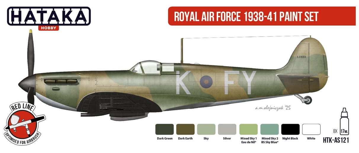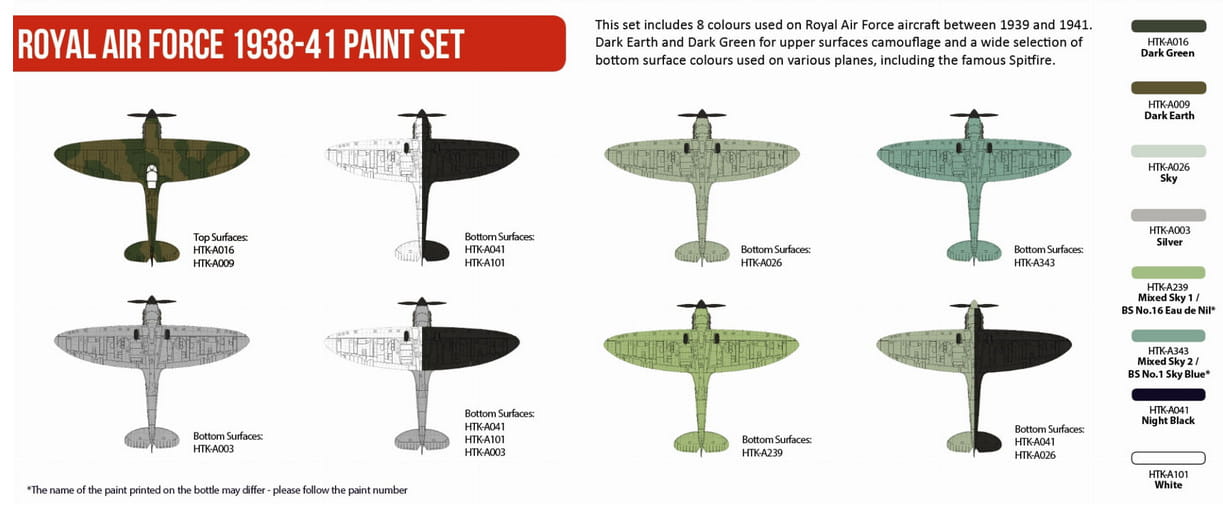 Zestaw farb akrylowych zawiera osiem kolorów używanych w samolotach Royal Air Force w latach 1939–1941. Dark Earth i Dark Green służą do kamuflażu górnych powierzchni, a także szeroki wybór kolorów dolnych powierzchni używanych w różnych samolotach, w tym słynnym Spitfire.