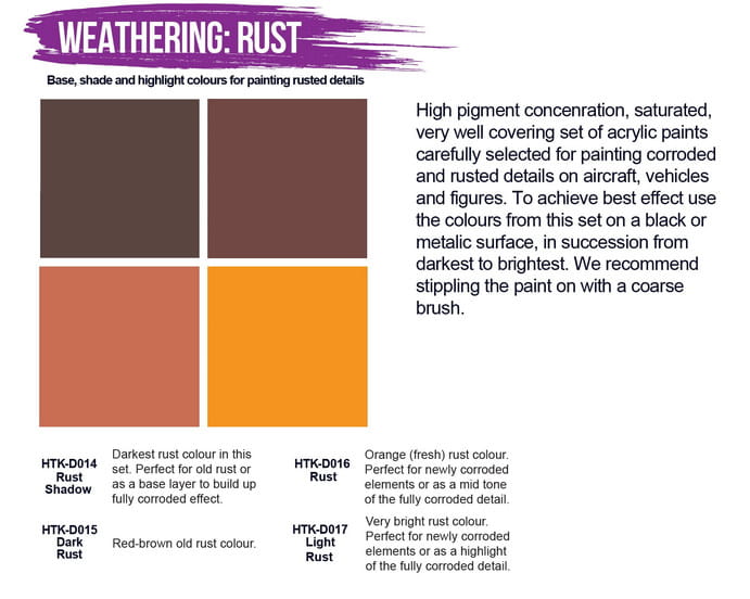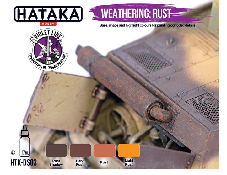 Zestaw farb akrylowych VIOLET LINE - Weathering: Rust. Wysokie stężenie pigmentu, nasycony, bardzo dobrze kryjący zestaw farb akrylowych starannie dobranych do malowania skorodowanych i zardzewiałych detali samolotów, pojazdów i figurek. Aby uzyskać najlepszy efekt, użyj kolorów z tego zestawu na czarnej lub metalicznej powierzchni, w kolejności od najciemniejszego do najjaśniejszego. Zalecamy nakładanie farby za pomocą grubego pędzla.